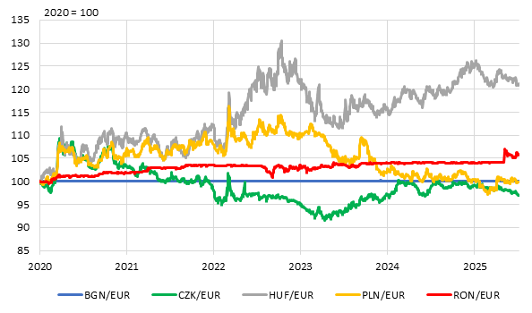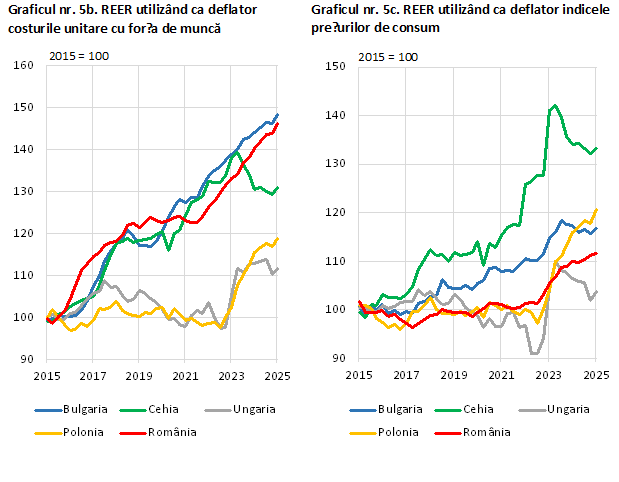 Aceiaşi doi indicatori, ULC şi preţurile de consum, sunt utilizaţi pentru o comparaţie între ţările din regiune (graficele 5b şi 5c). Datele au în vedere o perioadă mai lungă, 2015-2024. Se poate remarca, în raportarea la ULC, un proces de micşorare a decalajelor, în special pentru România şi Bulgaria, ţări care au pornit cu cel mai scăzut nivel al salariilor din regiune, în timp ce Ungaria este într-o sensibilă pierdere de viteză (indicatorul a revenit aproape de nivelul din 2017). Diferenţele dintre ţările din regiune sunt mai mari când cursul real efectiv este deflatat cu evoluţia preţurilor la consumator, care au suferit fluctuaţii ample, nu întotdeauna sincronizate temporal.