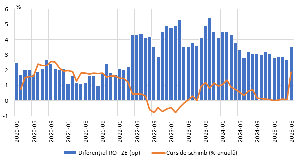 Graficul nr. 2. Cursul de schimb mediu și diferențialul de inflație dintre România și Zona Euro
