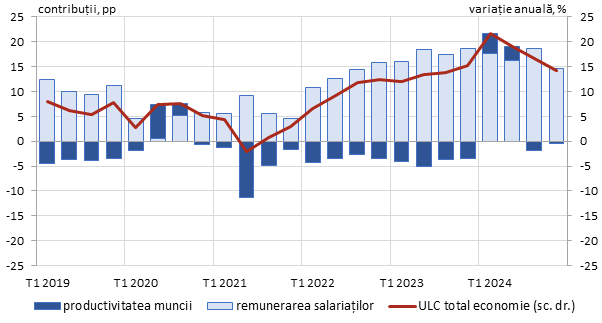 Totuși, ar fi probabil ca deteriorarea contului curent să fi fost mai pronunţată dacă doar dinamica ULC ar determina competitivitatea produselor şi serviciilor româneşti. Dar asta nu s-a întâmplat. Cum se explică această stare de fapt? Întâi, chiar dacă dinamica ULC a fost rapidă, nivelul absolut al costului forței de muncă rămâne încă semnificativ mai scăzut decât în alte țări europene. Astfel, costurile orare cu forța de muncă sunt încă cele mai reduse în Bulgaria (10,6 euro) și România (12,5 euro), mult sub nivelul mediu al UE în 2024 (37,3 euro). Ca urmare, noile investiții vin să fructifice în continuare acest decalaj în termeni absoluți, dar evident că aria pe care rămâne mai atractivă o investiție în România este mai îngustă decât era aceasta cu 10-15 ani în urmă. De unde și nevoia ca dinamica productivității muncii să devină mai semnificativă, pentru a valida creşterea salariilor şi a întări treptat competitivitatea produselor și serviciilor românești pe piața externă. Pentru asta, reducerea barierelor birocratice la investiţiile noi şi eliminarea mai rapidă a jucătorilor ineficienţi de pe piaţă ar putea contribui, indirect dar eficace, la atingerea acestui obiectiv.