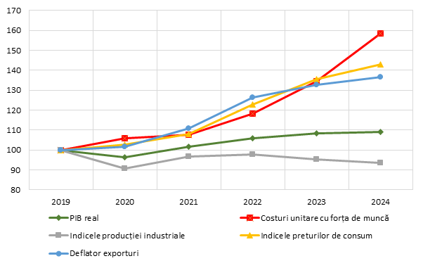 În ţara noastră, în ultimii ani, creșterea salariilor a fost susținută, depășind substanțial creșterea productivității muncii, care, de fapt, a fost mai lentă în ţara noastră (graficul nr. 4). Au existat mai multe cauze ale acestei stări de lucruri. Întâi, guvernul a încercat încă din 2017 o nouă politică, intitulată “wage-led growth”, care pornea de la ideea (foarte şubred susţinută atât teoretic, cât şi din vreo experienţă a altor ţări, care de fapt nu există) că, majorând puternic salariile în sectorul public, va fi stimulată creșterea consumului, iar de aici producția va fi şi ea stimulată. Ceva adevăr a fost în această gândire, în sensul că într-adevăr a crescut consumul – dar producția a crescut… în alte țări; la noi au crescut doar deficitul bugetar și cel de cont curent, cu mult mai vioi decât producția internă. Dar aşa se întâmplă când confunzi o iluzie fără vreun fundament cu o soluţie miraculoasă la probleme reale.