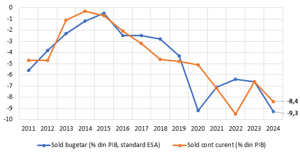 Însă, în situația particulară din țara noastră, avem o lungă perioadă, cam zece ani, în care deficitul bugetar a urcat din ce în ce mai mult, până la un vârf de 9,3% (după metodologia ESA) în 2024. Această deteriorare s-a împletit cu deficitul de cont curent, cele două “deficite gemene” acționând în tandem (graficul nr. 7). La nivel macroeconomic, se poate susține aserțiunea că întregul dezechilibru dintre cererea și oferta agregate se regăsește în deficitul bugetar, care este cauza primordială a excesului de cerere internă. Ceea ce înseamnă că, dacă se realizează reducerea deficitului bugetar și încadrarea lui în limita de 3% prevăzută în Tratatul de la Maastricht, se poate atinge concomitent restrângerea confortabilă a deficitului de cont curent, fără a fi necesară forțarea reducerii lui printr-o depreciere indusă de banca centrală.