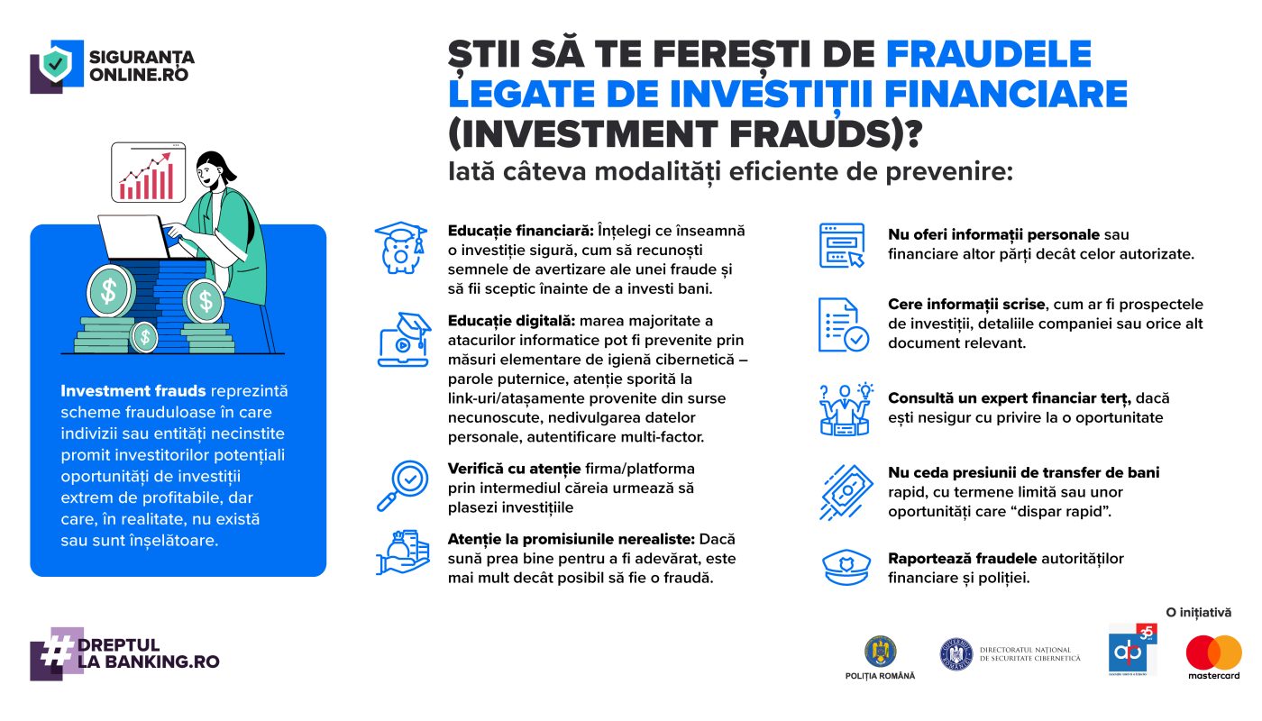 Poliția Română, Directoratul Național de Securitate Cibernetică (DNSC), Asociația Română a Băncilor (ARB) și Mastercard avertizează, prin intermediul proiectului național de educație digitală și prevenire a criminalității informatice #SigurantaOnline (www.sigurantaonline.ro), asupra unui nou val de tentative de fraudă online care implică utilizarea unor pagini web falsificate ce imită identitatea unor instituții media cunoscute, pentru a promova platforme fictive de investiții.